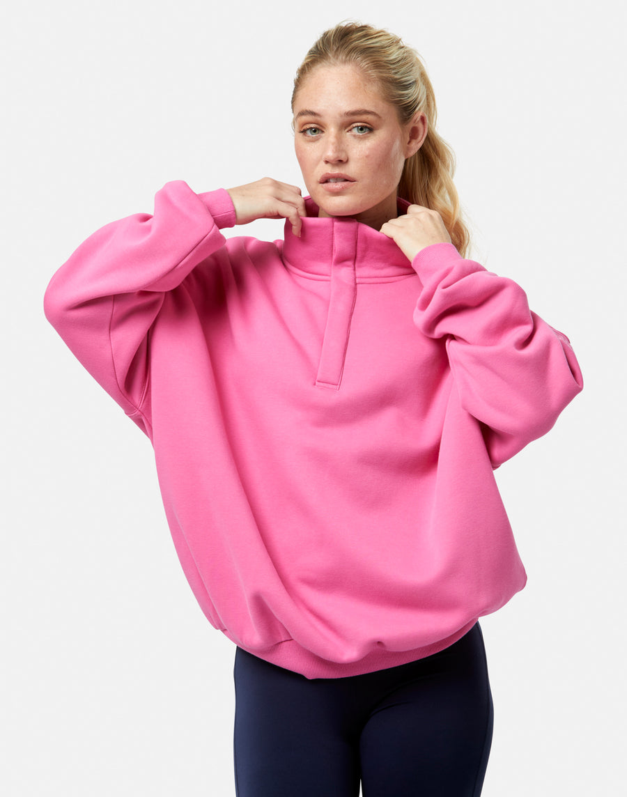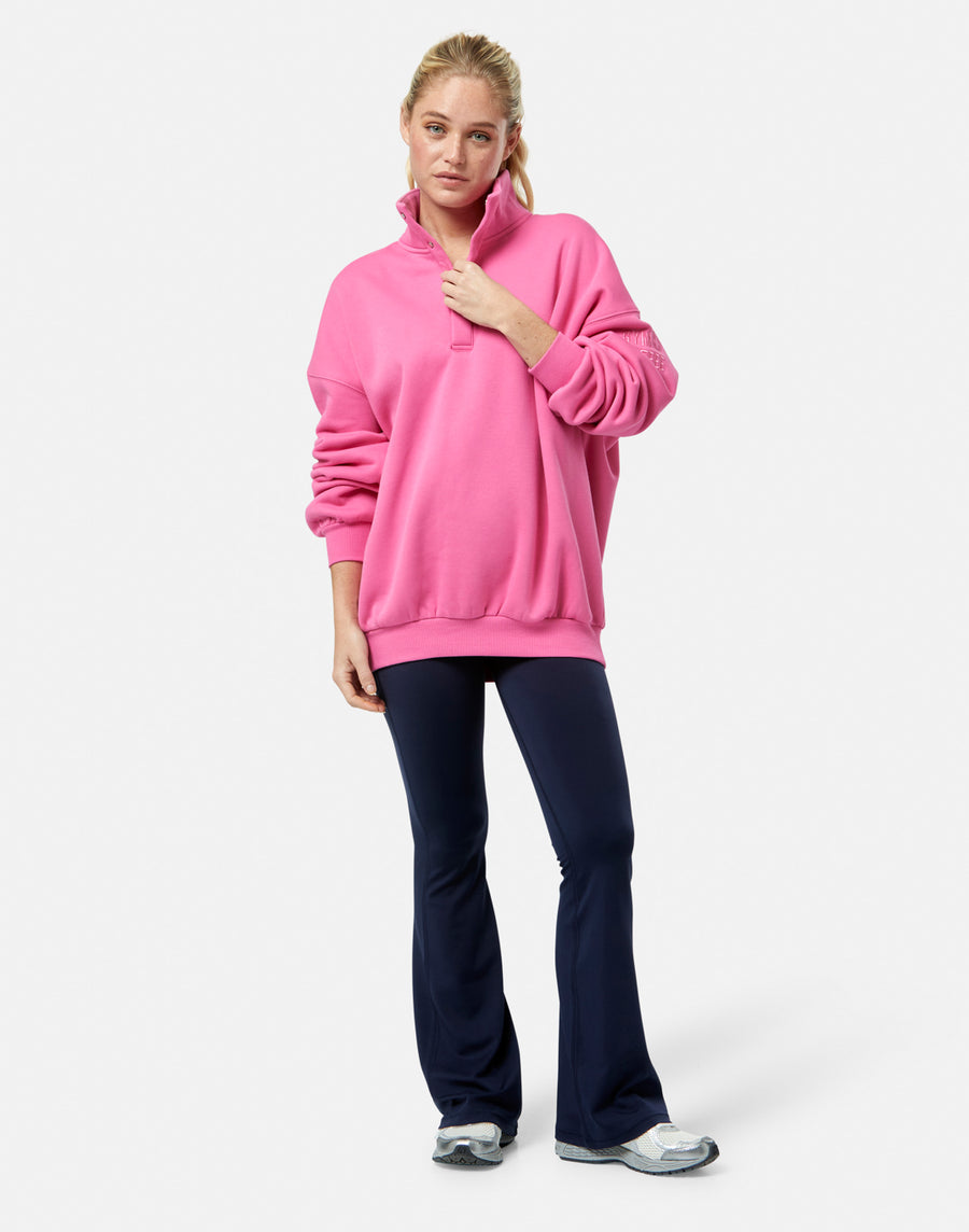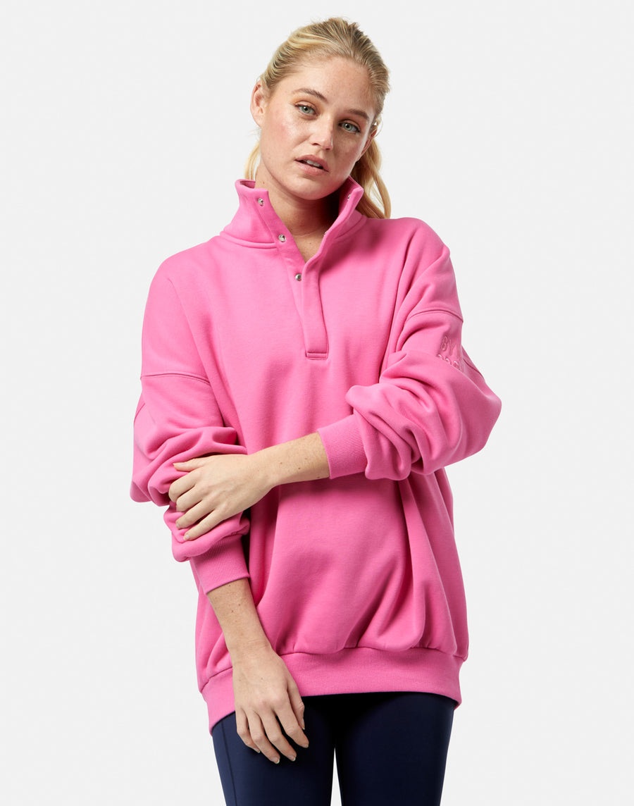 In a bold Sangria Sunset hue, this statement layer transitions effortlessly from pre-Pilates to off-duty moments and everything in between. Featuring our signature snap-up collar, an oversized fit, and an ultra-soft fabric.